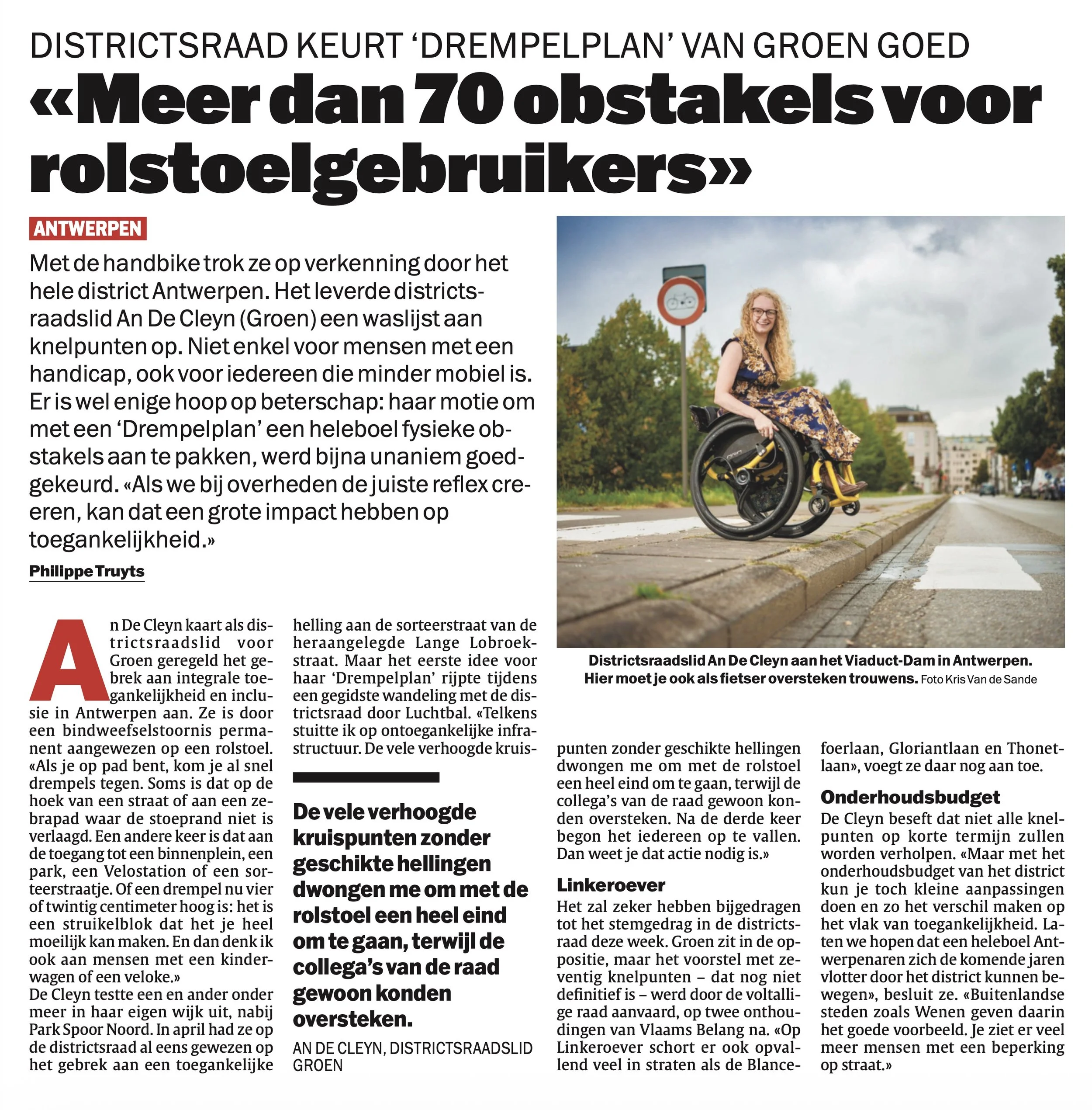 Op de eerste Antwerpse Districtsraad sinds het zomerreces stelde An De Cleyn (Groen) deze avond haar Drempelplan voor. Dit plan vraagt aan het bestuur om een hele reeks een hele reeks fysieke drempels in de openbare ruimte aan te pakken. Dit moet ervoor zorgen dat mensen die op op welke manier dan ook minder mobiel zijn op dezelfde manier aan het publieke leven kunnen deelnemen, zonder ongemak of omwegen.